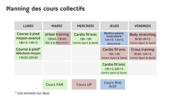 Pour ce qui est des cours dispensés dans le cadre de l’Université Populaire (en rouge) et de Midi Actif (en bleu), ils possèdent leur propre tarif et l’inscription est nécessaire directement auprès de ces organismes.