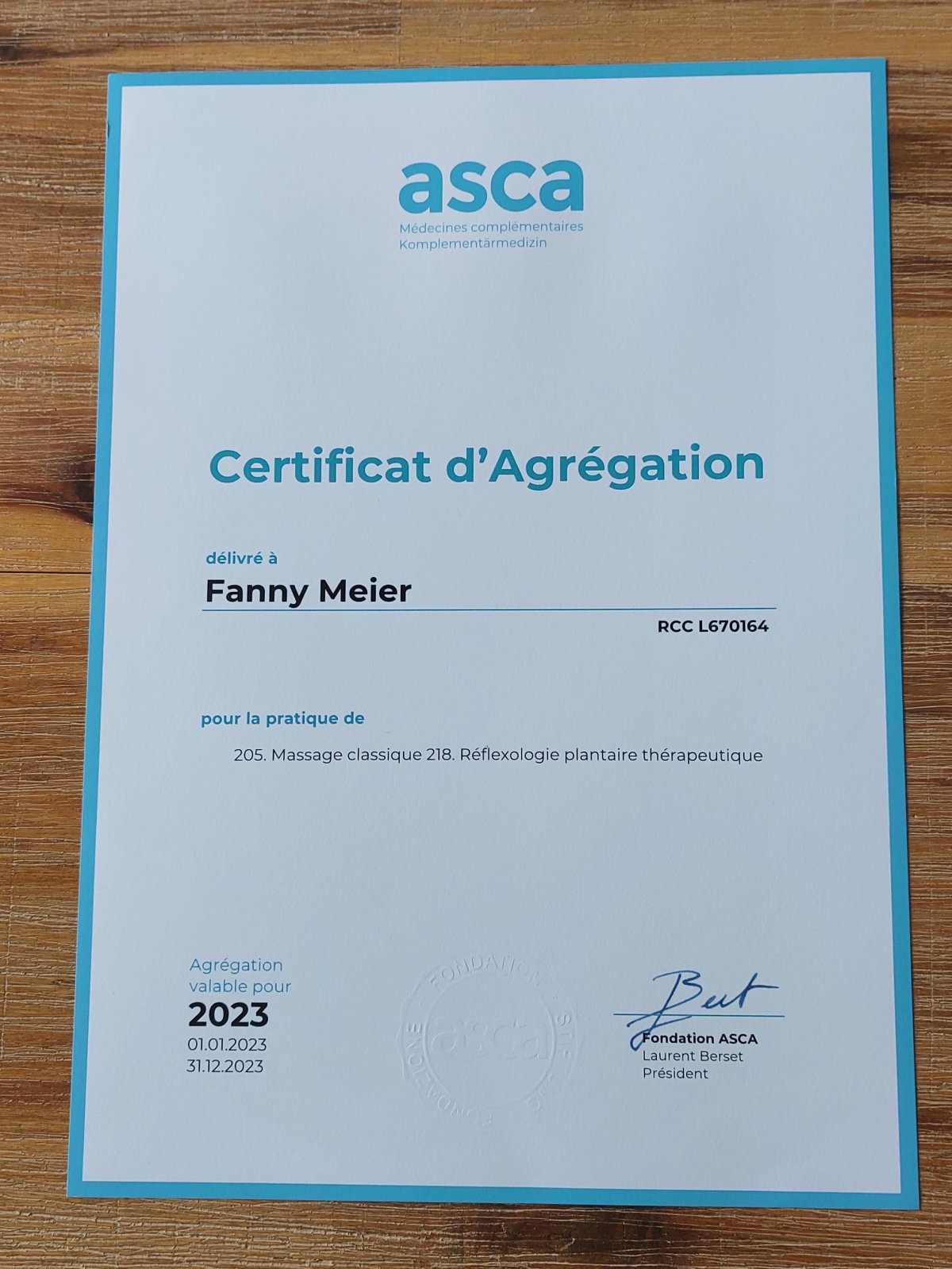Je suis certifiée en tant que Masseuse médicale avec brevet fédéral auprès d'ASCA et du RME et donc remboursée par la plupart des assurances complémentaires (à vérifier directement avec votre caisse car de nombreux contrats différents existent).